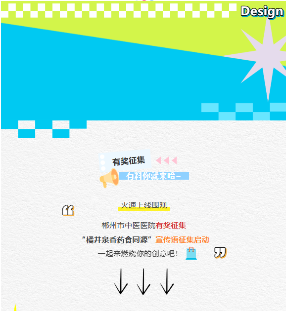 為讓中華傳統(tǒng)健康文化走進(jìn)現(xiàn)代生活,郴州市中醫(yī)醫(yī)院現(xiàn)面向全社會(huì)公開征集“橘井泉香藥食同源”主題宣傳語(yǔ),無(wú)論你是文字愛好者、文化達(dá)人,還是關(guān)注健康的普通人,只要有好創(chuàng)意,就能贏取豐厚獎(jiǎng)金,更有機(jī)會(huì)讓你的作品成為傳統(tǒng)健康文化的傳播名片!