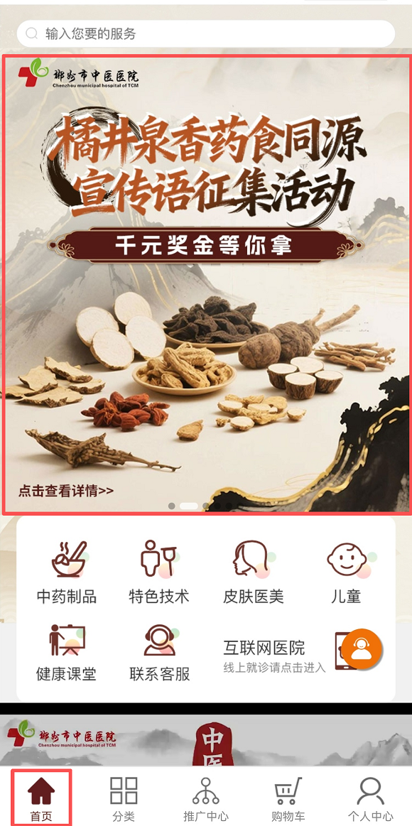 進(jìn)入橘井商城(院內(nèi)便民服務(wù)平臺(tái),可享制劑、藥膳等服務(wù))首頁(yè)。